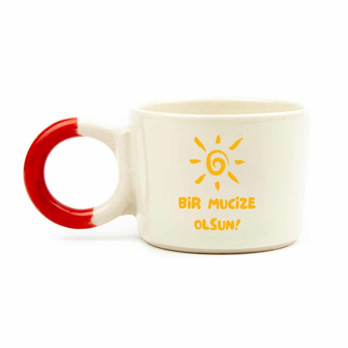 Bir Mucize Olsun! Krem Parlak Düğüm Kulp Fincan (Kırmızı Kulp) - Hediye Seramik Fincan