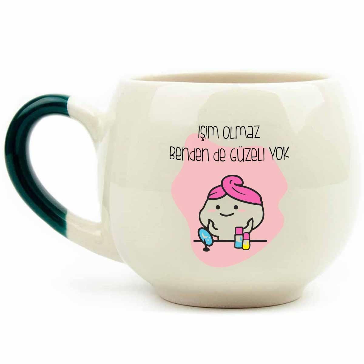 İşim Olmaz Benden De Güzeli Yok Krem Parlak Balon Kupa (Yeşil Kulp) - Hediye Seramik Kupa
