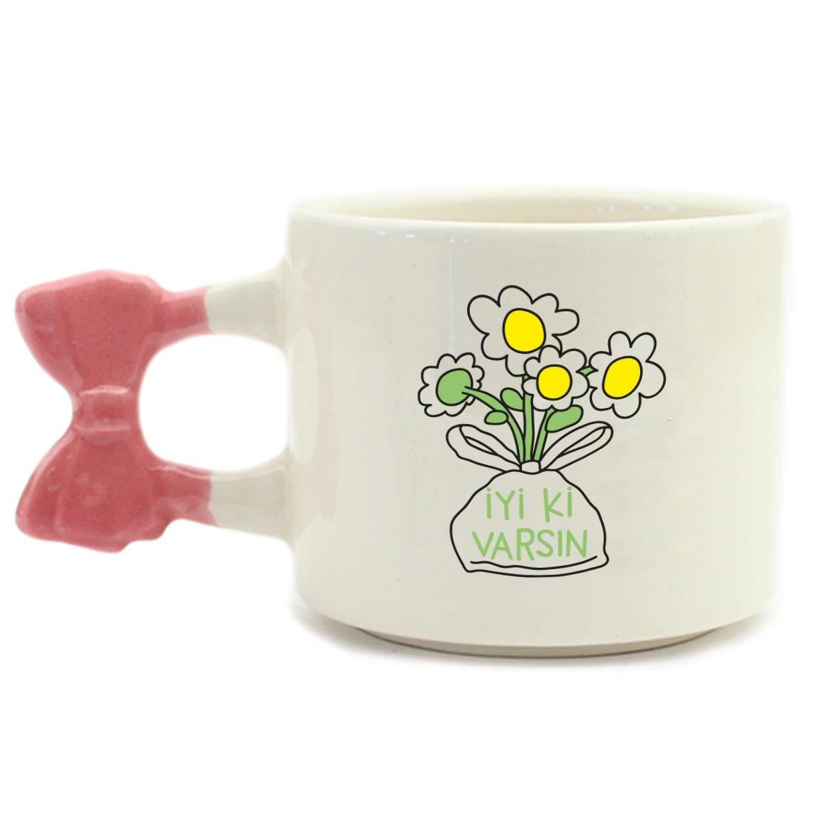 İyi Ki Varsın Papatya Buketi El Yapımı Krem Parlak Kurdele Kulp Kupa - El İşçiliği Hediyelik Kupa Bardak Mug