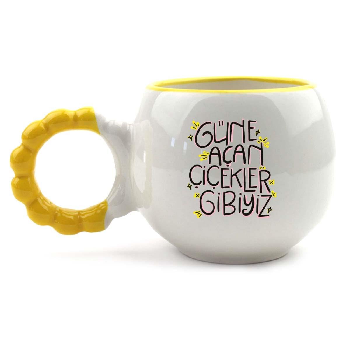 Güne Açan Çiçekler Gibiyiz El Yapımı Krem Parlak Puf Kupa - El İşçiliği Hediyelik Kupa Bardak Mug