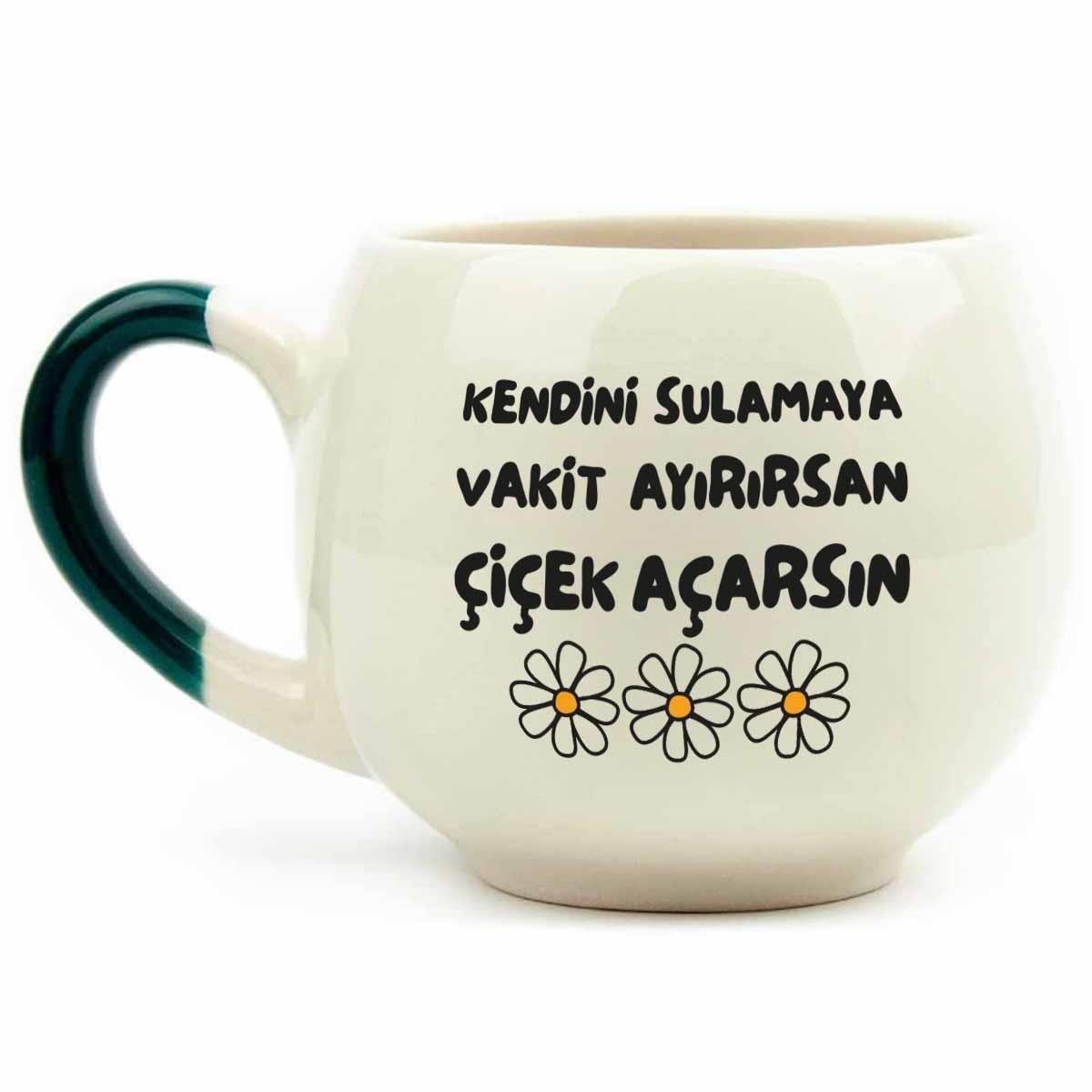 Kendini Sulamaya Vakit Ayırırsan Çiçek Açarsın Krem Parlak Balon Kupa (Yeşil Kulp) - Hediye Seramik Kupa