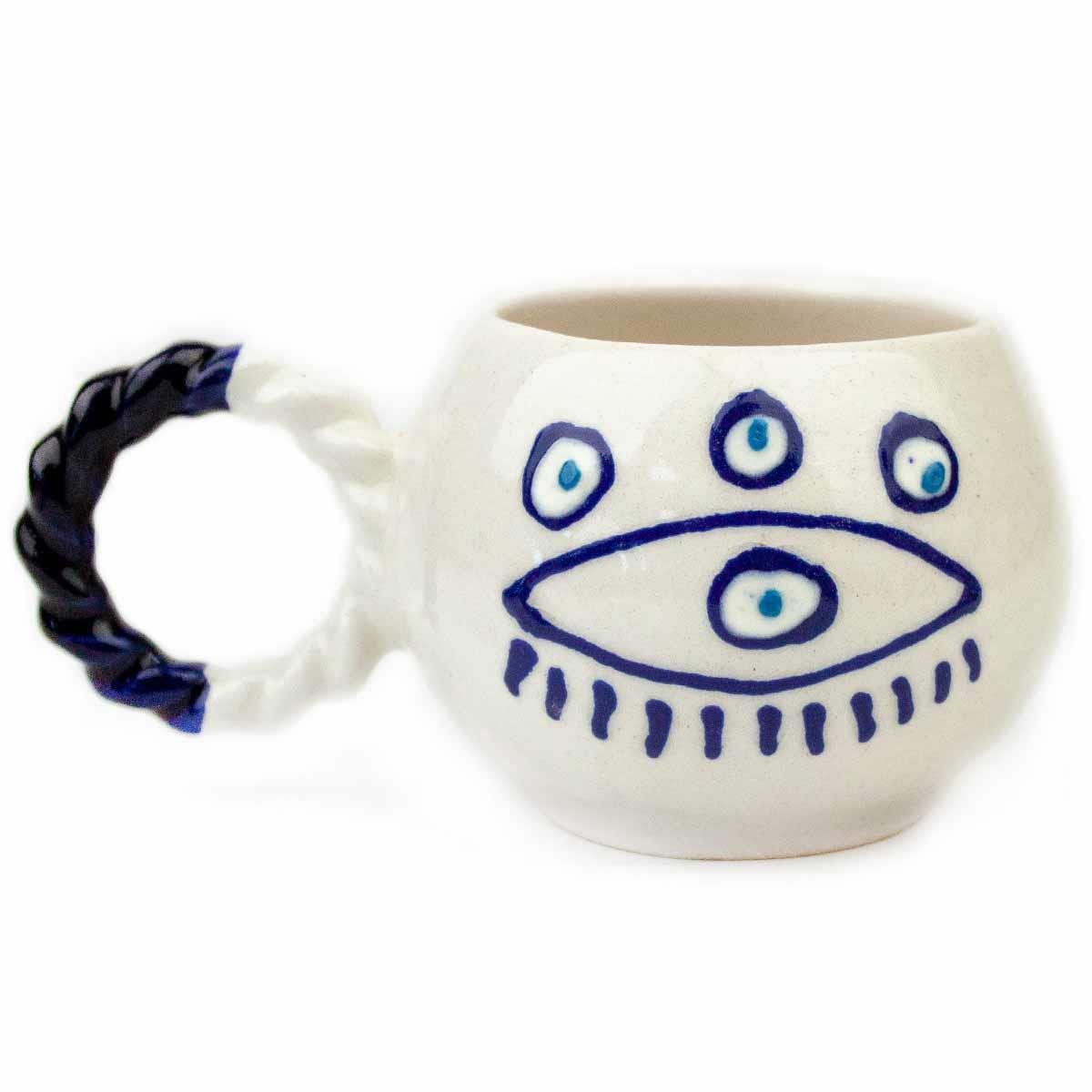 Nazar Boncuğu Desenli El Boyama & Kabartma Desen Krem Parlak Baloncuk Fincan - El İşçiliği Hediyelik Kupa Fincan