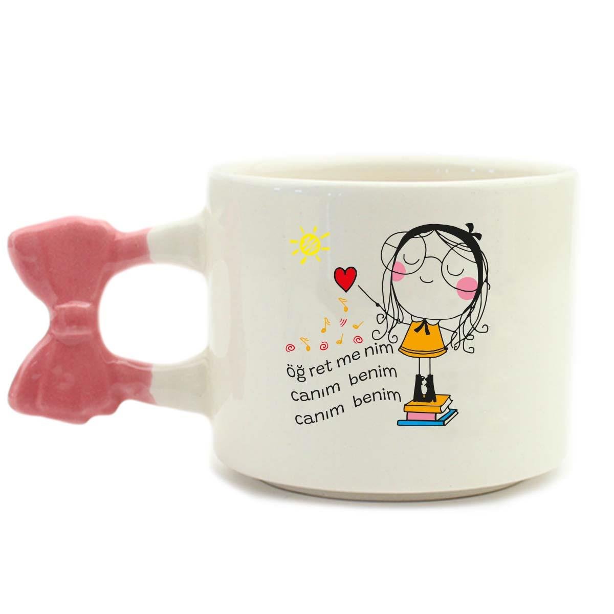 Öğretmenim Canım Benim Canım Benim! El Yapımı Krem Parlak Kurdele Kulp Kupa - El İşçiliği Hediyelik Kupa Bardak Mug (KUKUR016)