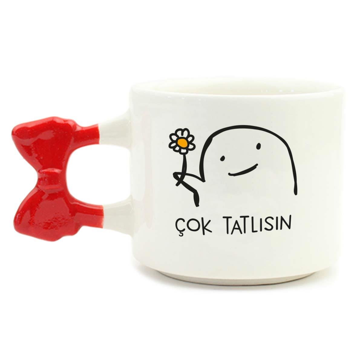 Çok Tatlısın El Yapımı Krem Parlak Kurdele Kulp Kupa - El İşçiliği Hediyelik Kupa Bardak Mug