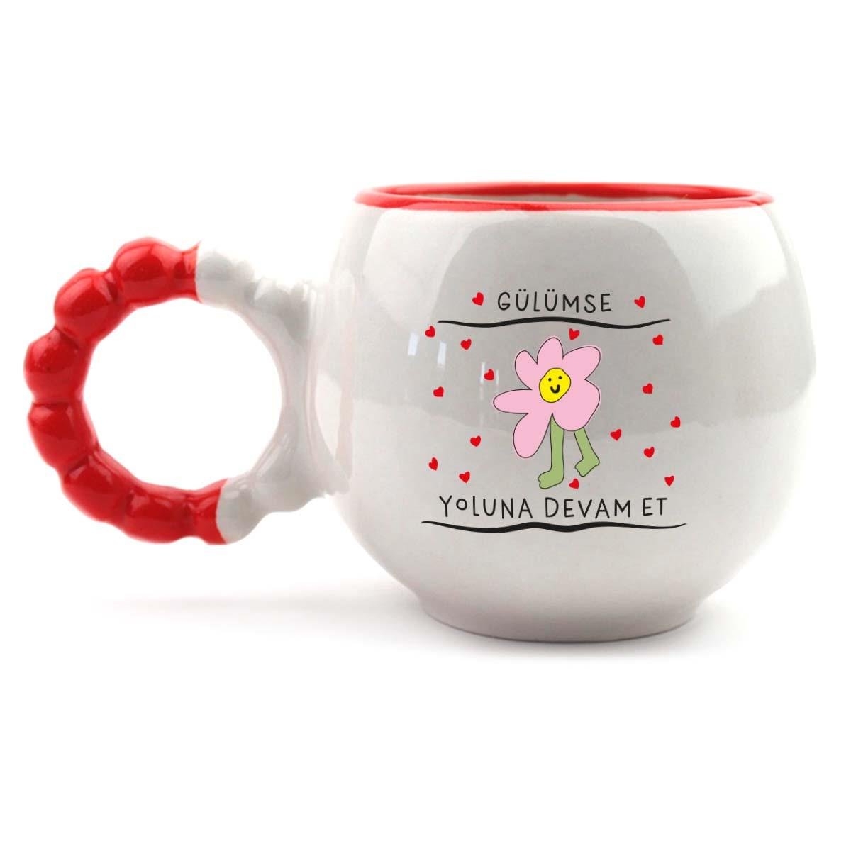 Gülümse, Yoluna Devam Et! El Yapımı Krem Parlak Puf Kupa - El İşçiliği Hediyelik Kupa Bardak Mug
