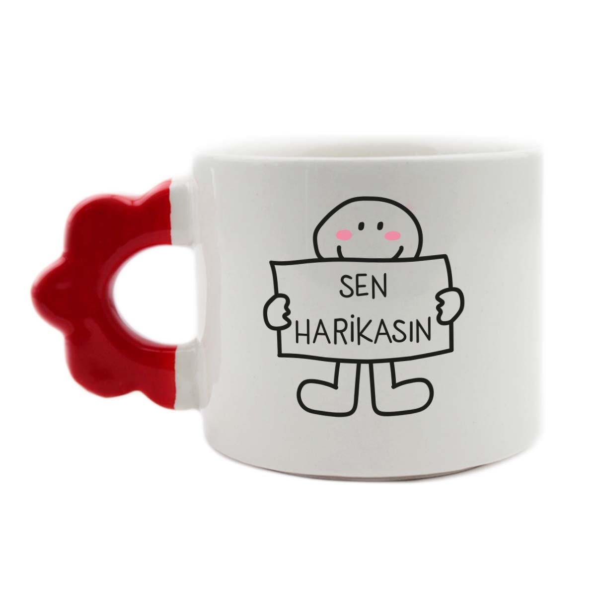 Sen Harikasın El Yapımı Krem Parlak Çiçek Kulp Kupa - El İşçiliği Hediyelik Kupa Bardak Mug