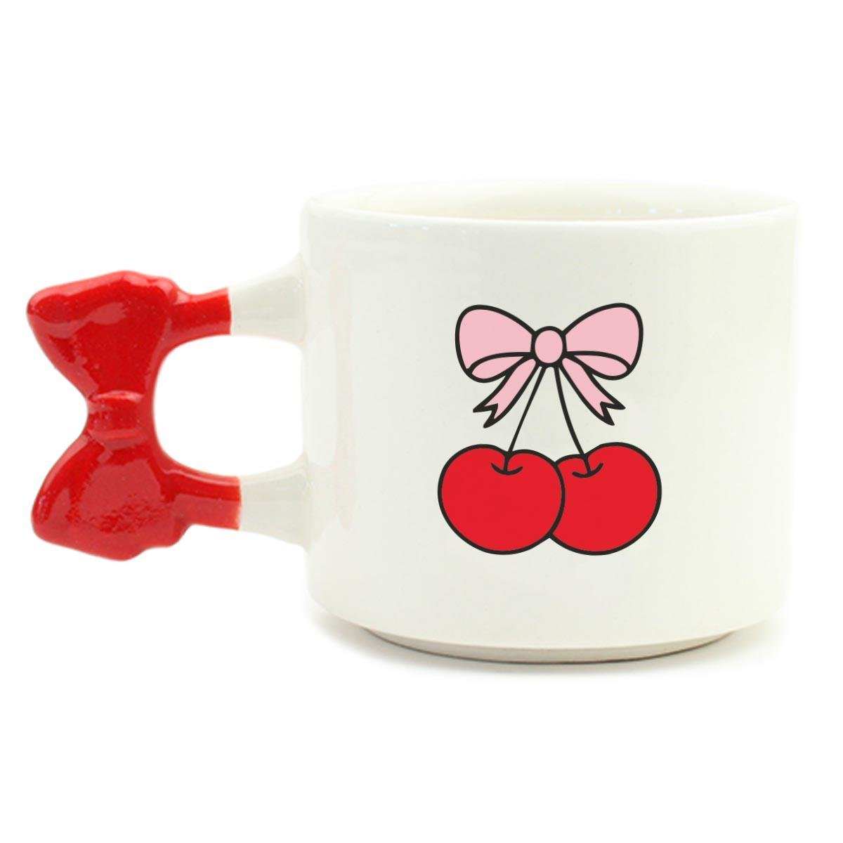 Kiraz Desenli El Yapımı Krem Parlak Kurdele Kulp Kupa - El İşçiliği Hediyelik Kupa Bardak Mug
